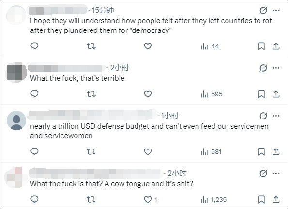 看到美军士兵分享的这份餐食图后,在社交媒体X平台上,网民们的评论是这样的……